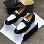 Elevate your footwear with these eye-catching bicolor loafers. A perfect blend of classic style and contemporary flair, these shoes feature a sleek black and white design that creates a bold visual contrast. The polished finish gives them a refined look, while the stylish gold-tone buckle on the top strap adds a touch of sophisticated detail.